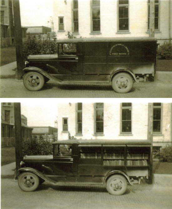 The truck in this photograph generated lots of interest, but there were no correct guesses received. This is actually an old bookmobile, used to bring books to those who wanted to read but couldn't get to the library. The Library emblem on the side was blocked out for the contest, but is seen in the untouched photograph below. At the bottom is the bookmobile with the sides opened so that books can be viewed.